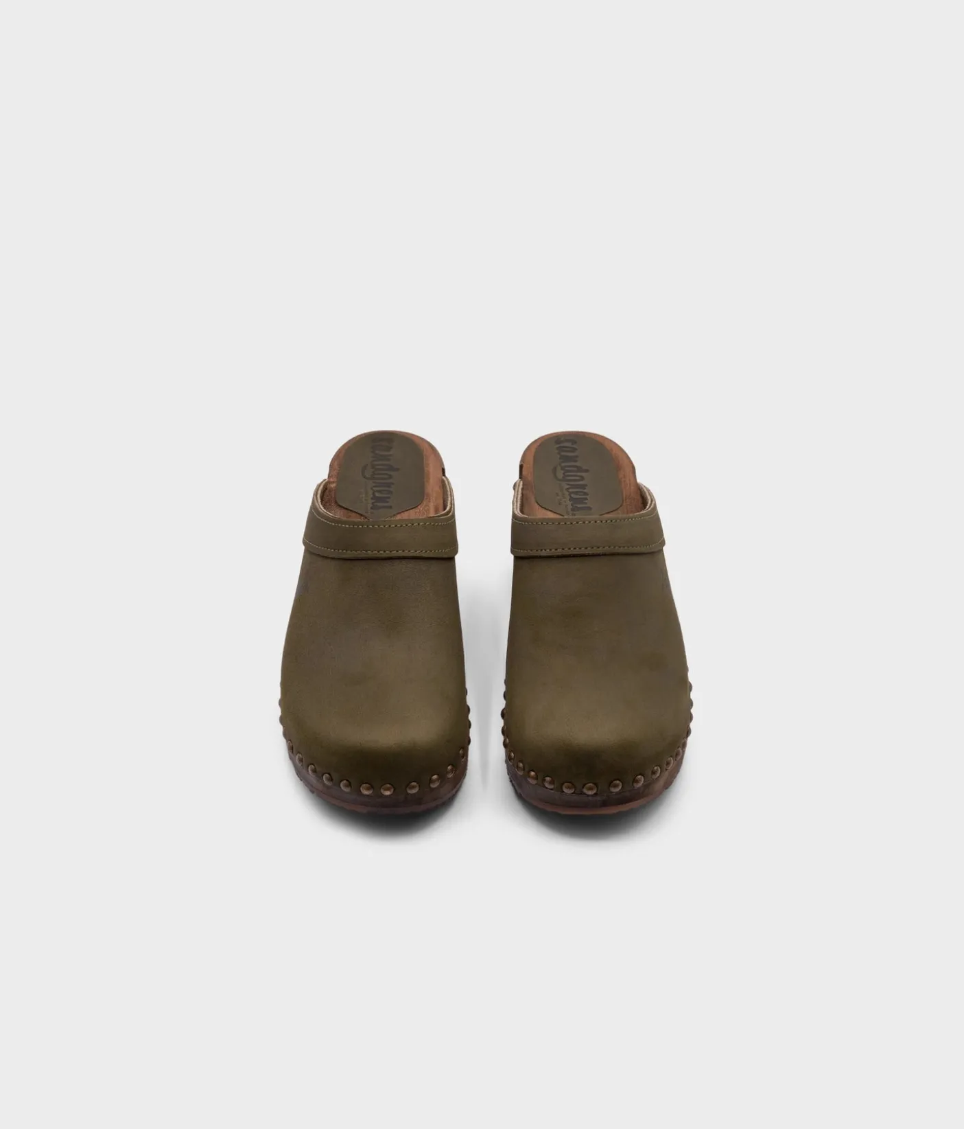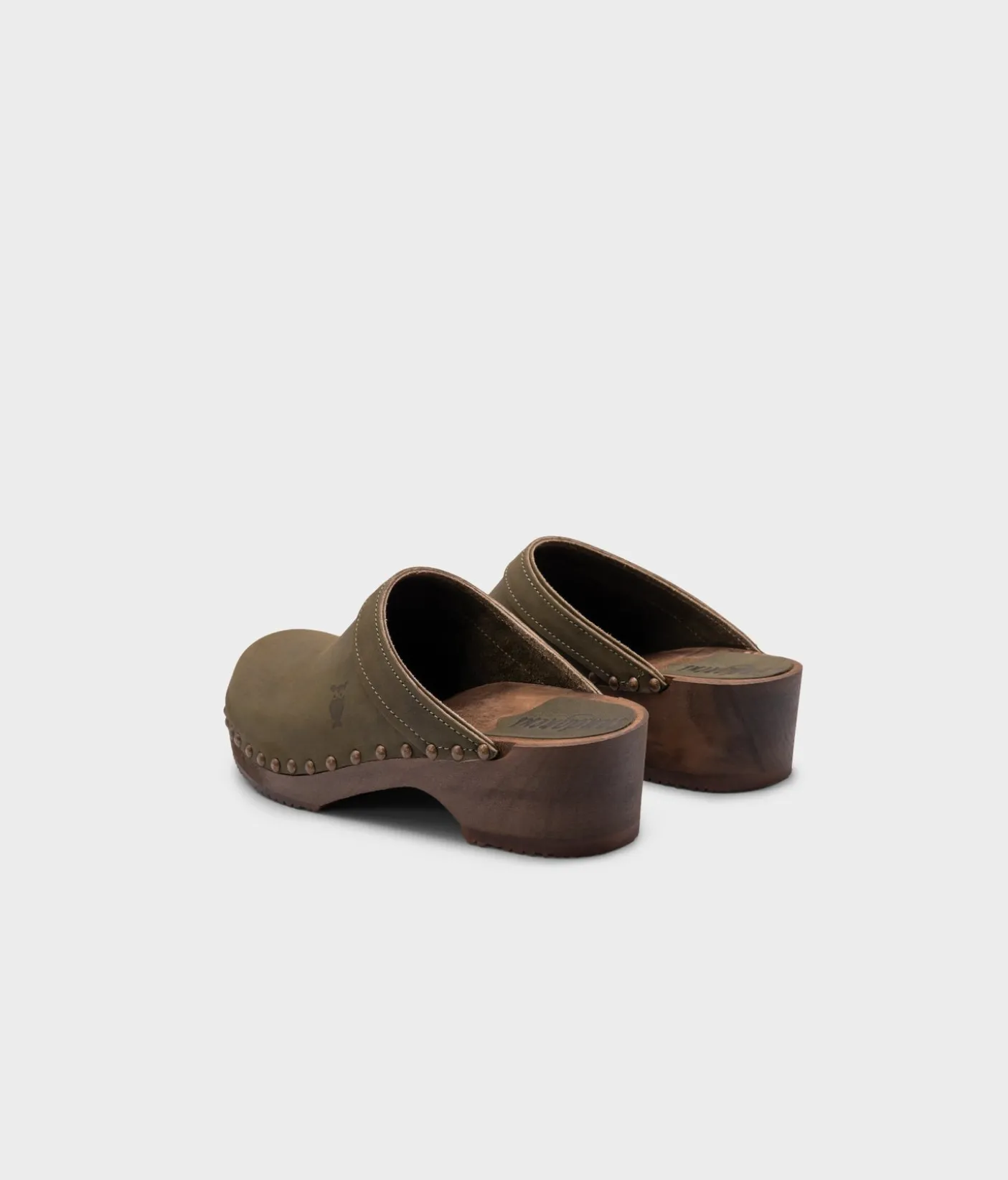 The classic clog mule with an extra touch. Athens wooden clogs in olive green, soft nubuck leather is the perfect low-heeled mule for everyday use. The gold studs take these classic clog mules to the next level. All Sandgrens Clogs have been ethically handcrafted with natural materials in Sweden since 1846.