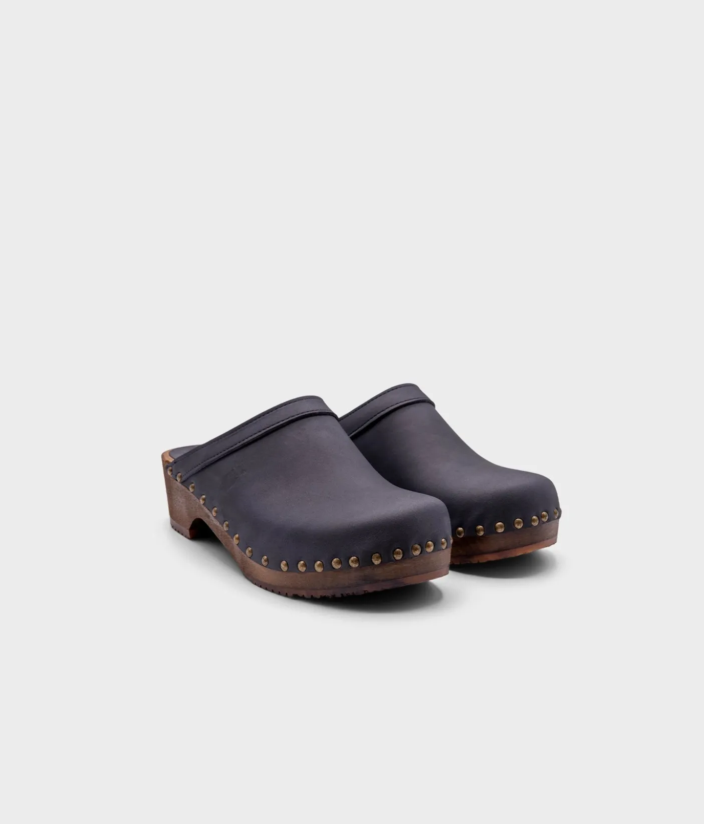 The classic clog mule with an extra touch. Athens wooden clogs in navy blue, soft nubuck leather is the perfect low-heeled mule for everyday use. The gold studs take these classic clog mules to the next level. All Sandgrens Clogs have been ethically handcrafted with natural materials in Sweden since 1846.