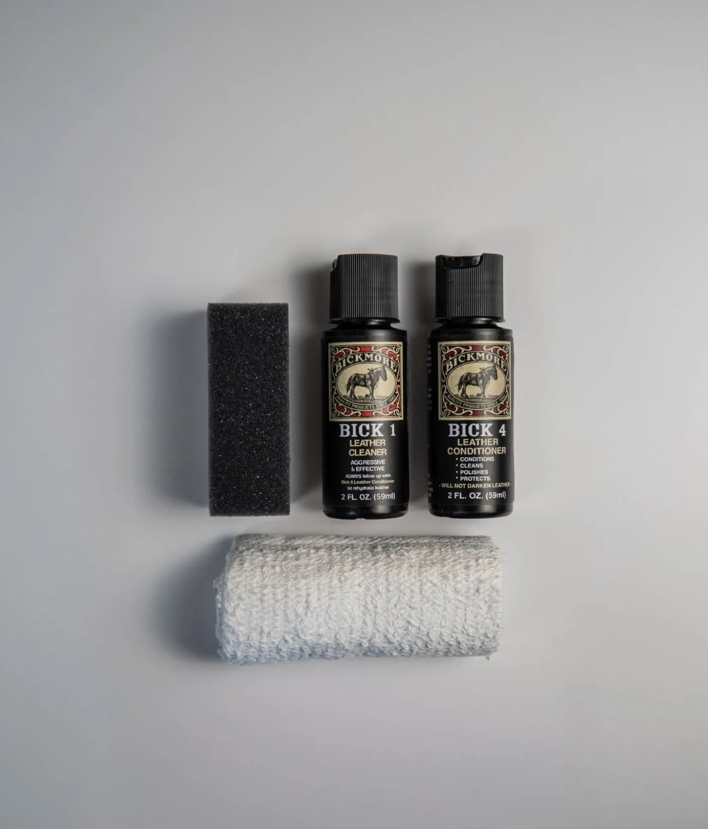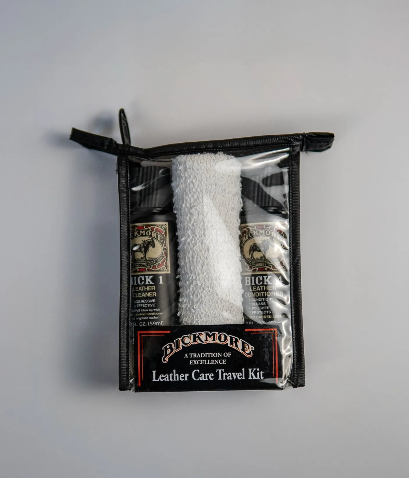 Travel Care Kit Contains: (1) 2oz Bick 1, (1) 2oz Bick 4, (1) Cleaning cloth, (1) Carrying Case, (1) How to Care for Leather Brochure Directions: