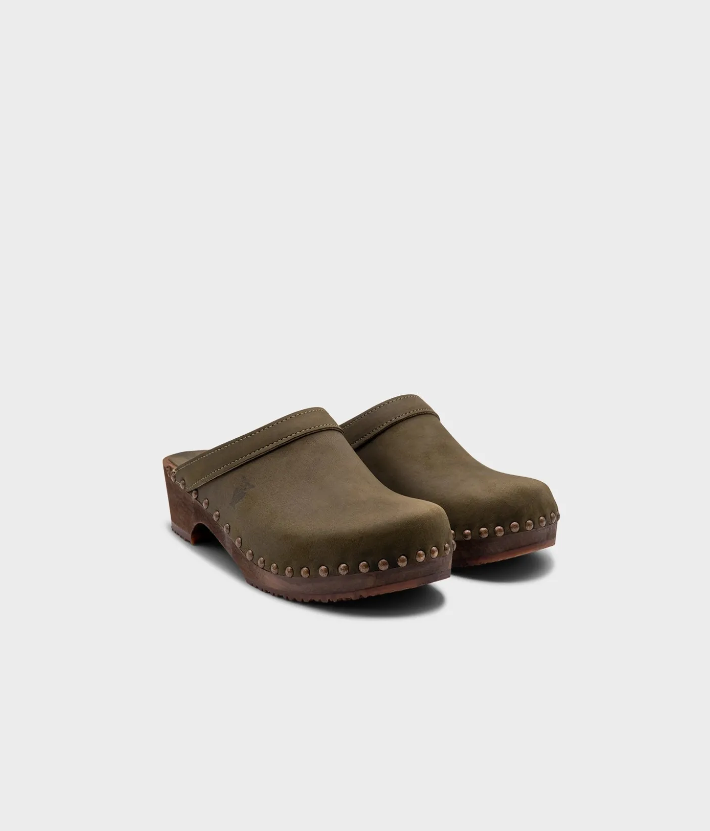 The classic clog mule with an extra touch. Athens wooden clogs in olive green, soft nubuck leather is the perfect low-heeled mule for everyday use. The gold studs take these classic clog mules to the next level. All Sandgrens Clogs have been ethically handcrafted with natural materials in Sweden since 1846.