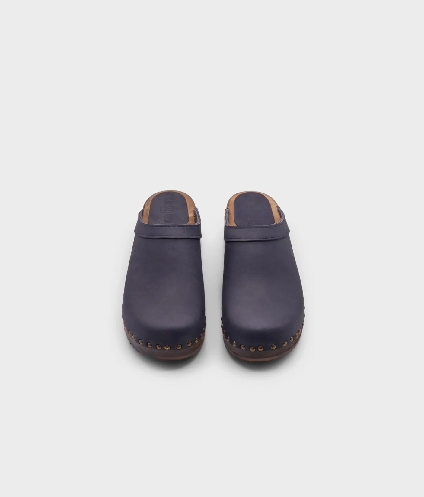 The classic clog mule with an extra touch. Athens wooden clogs in navy blue, soft nubuck leather is the perfect low-heeled mule for everyday use. The gold studs take these classic clog mules to the next level. All Sandgrens Clogs have been ethically handcrafted with natural materials in Sweden since 1846.
