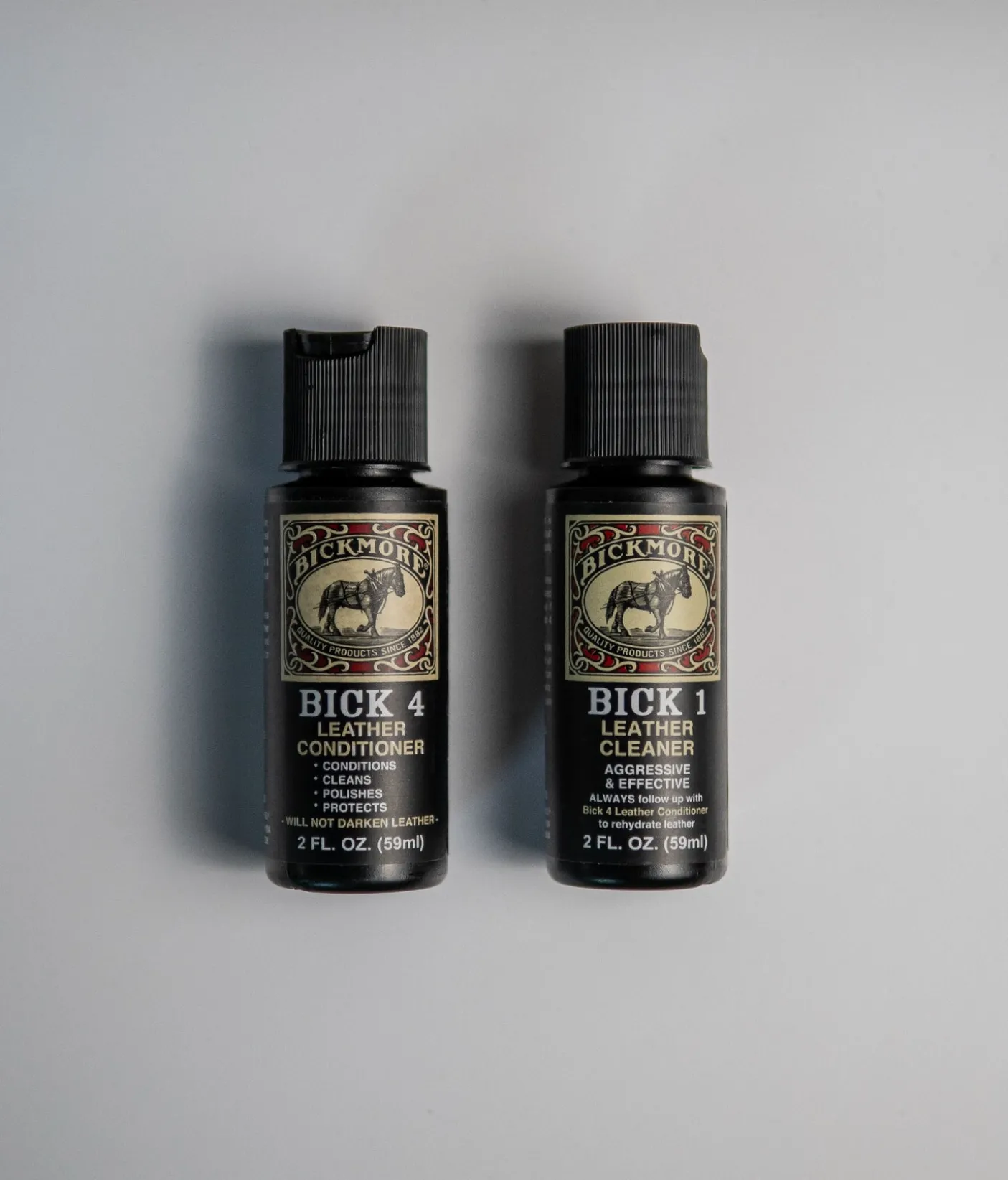 Travel Care Kit Contains: (1) 2oz Bick 1, (1) 2oz Bick 4, (1) Cleaning cloth, (1) Carrying Case, (1) How to Care for Leather Brochure Directions: